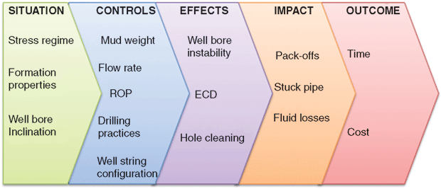 Figure 2 describes the situation in the left hand of the figure. Subsurface formation properties, stress regime and well bore orientation are key factors in defining the safe mud weight window, or the region in which well bore stability is maintained (“situation”). This safe mud weight window should be controlled under both static and dynamic hydrostatic pressure conditions. Naturally, the flow rate, rate of penetration, well configuration, string rotation and drilling practices are operational aspects that impact dynamic pressures. Drilling practices such as pumping sweeps to aid hole cleaning and back-reaming procedures help manage the dynamic conditions and ECD (“controls”).