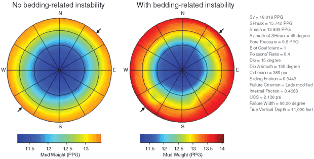 Typically, the section would be drilled with a 13.0 ppg equivalent static density (ESD) and 13.7 ppg ECD. Where bedding-related instability occurs, required mud weight in the least-favorable downdip direction is up to 0.7 ppg higher than for uniform formation strength. Here, required mud weights approach (or in some cases exceed) the available fracture gradient.