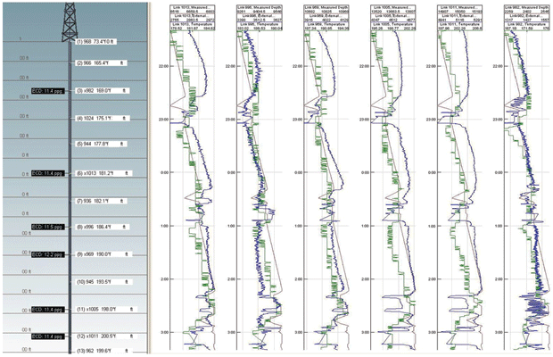 The networked drill string uniquely provides the means to identify and analyze the annular pressure at discrete points along the drill string (i.e., at each network node, typically spaced 1,500 feet apart). The along-string annular pressure evaluation capability is available during static conditions for identifying ESD and better managing ECD during dynamic conditions. Figure 4 displays along-string temperature and annular pressure measurements at six discrete network nodes for a typical well profile during the campaign.