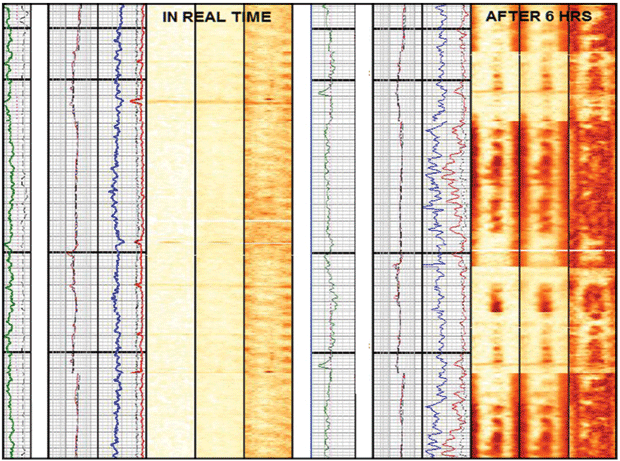 The light colors shown in the “as drilled” real-time image show the bore hole to be in-gauge at the time of drilling. However, after six hours of exposure, the dark colors seen in the short-based image (less than two inches in depth of reading) indicate bore hole enlargement. The enlargement is more uniform in the top half of the image and is only slightly rotated from the top-bottom orientation in the lower half of the image. The long-based image (shown in the center of the three images) has a depth of investigation of three to five inches.