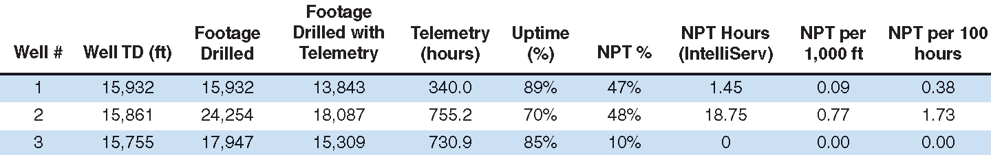 More generally, the approach of relying on comprehensive measurements and experts to provide accurate diagnosis of downhole phenomena, followed by their assistance to the rig team in improving practices, has validity more widely in drilling and completions activity. The summary of the transformational performance improvement and system reliability is presented in Table 1. Well bore instability NPT was reduced from 47 and 48 percent, respectively, on the first two wells to 10 percent on the third well, and trouble time was limited to rig equipment.