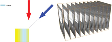 Combining a dual-beam SEM instrument for high-resolution imaging with a focused ion beam for milling to remove material layers as thin as a few nanometers allows layers to be removed and imaged in sequence. The images are registered first (aligned on common features) and then interpolated in a direction normal to the slices, as shown in Figure 1. The electron beam (blue) generates a high-resolution two-dimensional image of the sample surface. The ion beam (red) removes a thin layer of material by milling, creating a new surface parallel to and aligned with the first slice. The imaging and milling processes then are repeated.