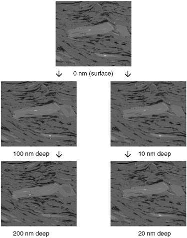 Consecutive slices show the variations as more material is removed. The top slice is the surface, and the images beneath it are taken with steps of 100 (left) and 10 (right) nanometers. Backscatter electron images were acquired with 3.0 nanometers resolution. The horizontal field width is 15 micrometers.