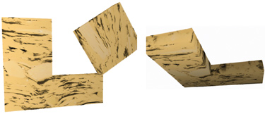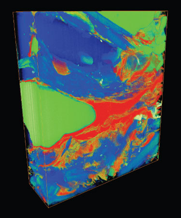 The 3-D models produced are quite small. For example, the model shown in Figure 4 is 10 micrometers wide by 2.5 micrometers thick. In this example from a Marcellus Shale core sample, the SEM volume shows the porosity (gold) and kerogen (red) network. The blue and green colors are mineral matter. To generalize from such small volumes, a statistically significant number of sites along the ion-milled edge must be studied, and so must many more samples. But the insights gained from initial studies provide valuable information about complex shale microstructure.