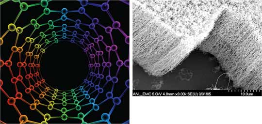 Carbon nanotubes are essentially continuous Buckyballs, allotropes of carbon with a cylindrical nanostructure. Nanotubes can be single- or multiple-walled, and have been constructed with a length-to-diameter ratio of up to 132 million-to-1, significantly larger than any other material. The carbon-to-carbon bond is the strongest of all possible elemental bonds, with nanotubes exhibiting tensile strengths 100 times that of steel. In addition to their extraordinary strength, nanotubes have novel electrical and thermal conductive properties that give them potential value in a range of oil and gas applications. A single-wall, 1-nanometer carbon nanotube is shown at left, with a large number of aligned carbon nanotubes shown at right.