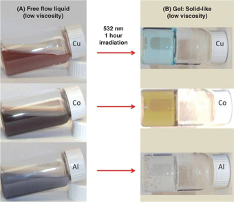 Nanofluids are designed by adding nanoscale particles in low volumetric fractions to a fluid to enhance its rheological, mechanical, optical and thermal properties. The liquid phase can be oil, water, ethylene glycol or conventional fluid mixtures and the nanoparticles are carbon, metals and metal oxides, and inorganic materials with properties of no dissolution or aggregation in a liquid environment. These photographs show a nanofluid containing cation-exchanged laponite. When metal powders are mixed with the laponite suspensions, they have no effect on suspension viscosity and the resulting solutions remain free-flowing liquids. When these metals are intercalated into the interlayer of the laponite disks, however, viscosity increases several hundred times and the solution turns into a gel strong enough to hold its own weight. Such gel strengths can suspend barite and other weighting materials used in drilling fluids. Courtesy of the National Energy Technology Laboratory.