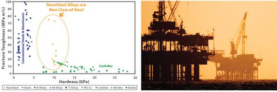 Nanostructured steel surface technologies are enhancing the physical properties of oil field tubulars, piping and other equipment. Nanostructured alloys for thermal spray coating and weld overlay for hardfacing and wear plate applications combine high hardness and toughness properties for exceptional resistance to corrosion, erosion, impact and wear. As shown in the figure at left, nanostructured steel alloys provide a new class of steel, with hardness fracture toughness exceeding conventional alloys. NOV Grant Prideco’s Platinum® HB, developed in partnership with The NanoSteel Co. using its Super Hard Steel® technology, is engineered for drill string hardbanding applications to provide high strength for minimum casing wear performance and tool joint protection as well as high toughness to resist cracking and spalling in severe downhole applications.