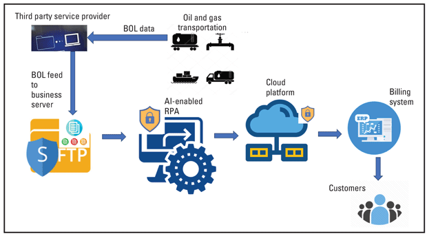 Modern AI and machine learning technologies have tremendous potential to address the many components that complicate oil and gas billing processes. Figure 1 illustrates how intelligent RPA, coupled with integration platforms, can mitigate these complexities and facilitate automatic billing with minimal manual intervention.