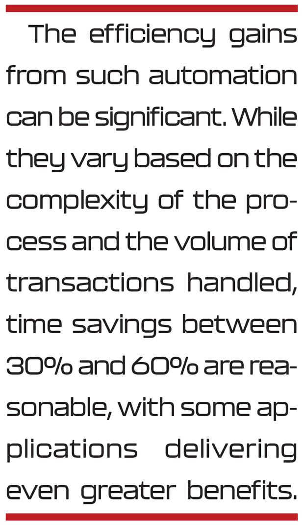 The efficiency gains from such automation can be significant. While they vary based on the complexity of the process and the volume of transactions handled, time savings between 30% and 60% are reasonable, with some applications delivering even greater benefits. The efficiency improvements come from automating previously manual tasks associated with entering and validating data, correcting errors and performing complex calculations.