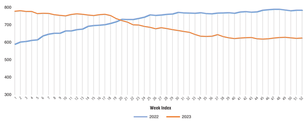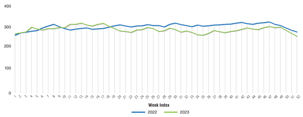 Some of the same 2022 recovery story for drilling rigs holds true for frac spread counts. The gradual uplift from 244 at the beginning of 2022 resulted in a year-end count of 258. It should be noted, however, that many drilling crews keep working during year-end holidays, while many frac crews take a break. Removing the year-end shutdown and subsequent startup shows that frac crew counts were closer to a 275 level during 2022, hitting a high of 300 on Nov. 23. Nevertheless, a year-to-year comparison shows frac spreads were lower in an approximate range of 20-30 through most of 2023, compared with 2022.