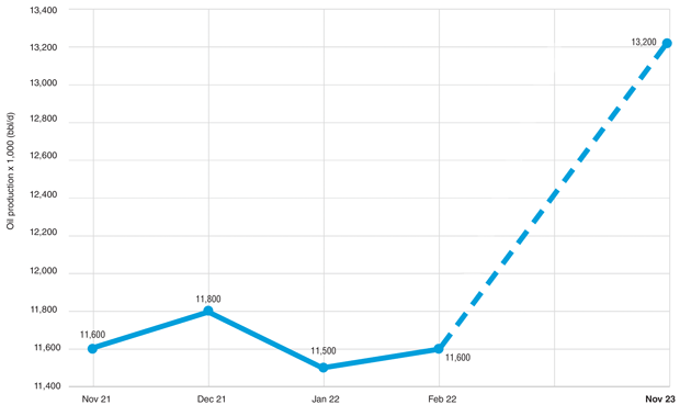 In a demonstration of ramping U.S. production in a compressed period and with fewer drilling and frac crews, the U.S. Energy Information Administration’s February 2022 production data totaled 11.6 million barrels a day. November 2023 set a record of 13.2 MMbbl/d which produced a gain of 1.6 MMbbl/d.