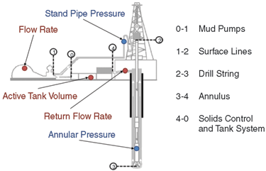 Changes in material balance–the volume and mass of the drilling fluid–can result from an influx of formation fluid into the annulus, a loss of drilling fluid to the formation, and contaminants continuously added to the drilling fluid during the drilling process. Contaminants are generally solids, saltwater, or any other material that causes an undesired change of drilling fluid properties such as rheology and density.