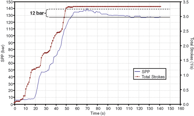 Figure 6 shows a case where a type 2 startup was performed within 45 seconds. Additionally, the pump-off time of 18 minutes was comparatively long. The resulting pressure peak has a magnitude of 16 bars. One interesting feature is the smaller pressure peak at around 30 seconds. Similar behaviour at intermediate strokes is apparent for almost all type 2 startup sequences, which may be related to initial gel breaking.