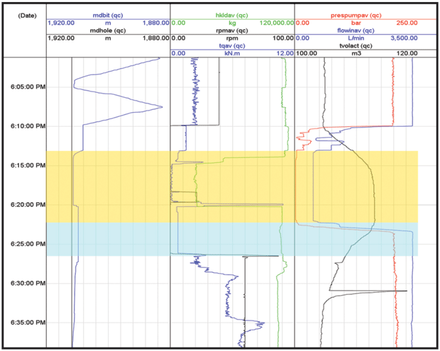 By using advanced automated drilling performance measurement software, which rigorously controls the quality of real-time sensor data measured by mud logging and directional drilling companies, it is possible to automatically detect relevant pump startup operations. A “weight-to-weight connection” (representing the time between two drilled stands, which starts when the drill string is lifted off bottom and lasts until the string is on bottom again) typically covers the required timeframe to include the full sequence required for analysis. This operation includes all time spent on well bore conditioning as well as the drilling slip-to-slip connection conducted during this interval.