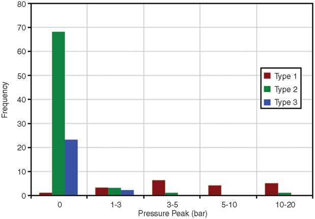 Drilling data from a 13,000-foot vertical well were analyzed to evaluate all three pump startup procedures. A total of 117 startup sequences and corresponding parameters were detected and used for visualization. Figure 4 illustrates the frequency of pump startups by type and the corresponding pressure peak ranges. Generally, type 2 (stepwise increase) and type 3 (incremental increase) startups showed the lowest pressure peak magnitudes, while almost all the type 1 (sharp increase in total strokes) startup procedures were in the magnitude of 3-20 bars.
