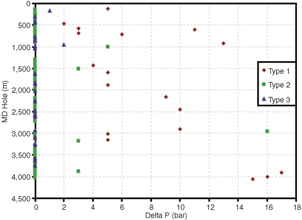 Looking at delta pressures, Figure 5A depicts pressure peak behavior over measured depth (MD Hole) in the well, with the three types of pump startups depicted by different colors and dot styles. Generally, a dependence on larger pressure peaks with increasing MD Hole was observed for type 1 pump starts. This may be related to the smaller annular clearance and increasing mud weight and gel strength as depth increases. The type 3 startup procedure exhibited no peak over the entire depth, with the exception of two cases, which could not be further specified.
