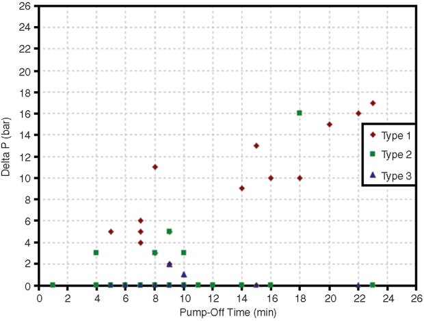 Generally, a type 1 startup exhibits a decreasing pressure peak toward a slower pump startup. There were five instances where a pressure peak was exhibited during a type 2 startup on this well. This may be related to shorter pump start times (amount of time required to bring the pump to full strokes). A chart of delta pressure versus pump startup times indicates a time below 60 seconds for all five of these cases, which is generally faster than a typical type 2 pump startups.