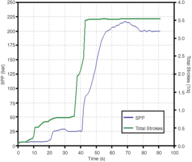 As shown in Figure 2, after the pumps have been brought up to full strokes, the standpipe pressure exhibits a maximum of 141 bars at 70 seconds (dashed line). At 120 seconds, the standpipe pressure reaches a stabilized value of 129 bars (solid line). In this case, the magnitude of the pressure peak is 12 bars. Expressed as equivalent circulating density (ECD), this represents an increase from 1.36 to 1.42 kilograms/litre.