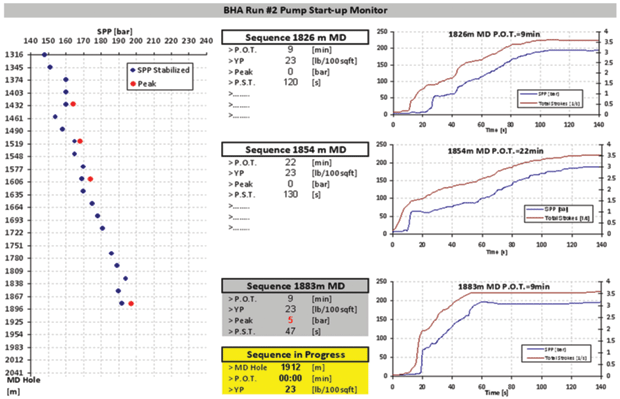 For routine drilling operations, observing the response of the standpipe pressure during pump startup operations represents one essential element of real‐time drilling hydraulics monitoring. Drilling fluids are designed to form a gelled structure once circulation is stopped and the well is under static condition. This is necessary to keep cuttings and weighting materials in suspension. Once a gelled structure is formed, the energy required to break it will be higher. Consequently, a pressure peak is observed on the standpipe pressure log that can be much higher with increasing inclination of the well as a result of cuttings sliding toward the BHA. Especially in narrow “drillability” windows, this pressure peak may lead to formation fracturing, lost circulation, kicks and even the collapse of the well bore.