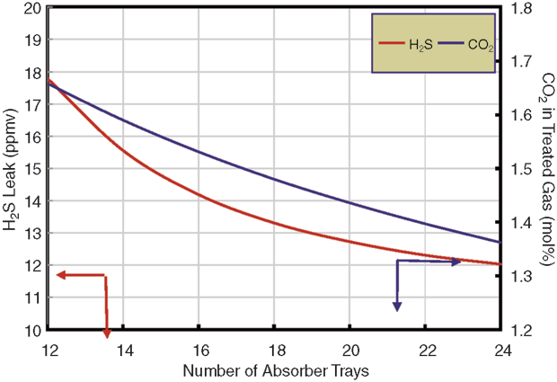 As shown in Figure 1, adding single-pass trays would reduce the H2S leak, but not enough to meet specifications at the designed gas flow. The problem with the absorber is that the more trays there are, the more CO2 is removed. The solvent removes the wrong component (CO2) at the expense of the noncompliant component (H2S). No matter how many trays are used in the absorber, generic MDEA cannot allow the gas specification to be met at design rates.
