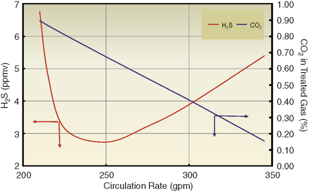 In addition, the reboiler energy input would act on less solvent, although there was unlikely to be real benefit from a lower solvent flow per unit of reboiler duty, since the same amount of absorbed gas would still have to be stripped. Figure 2 shows simulated treating results for a 20-tray absorber containing two-pass trays as a function of solvent rate. The mass transfer rate-based model shows there is an optimal solvent circulation rate around 250 gallons a minute (70 percent of the pump capacity) that will produce gas a little below 4 ppm H2S by volume with 2.0 percent CO2 content.