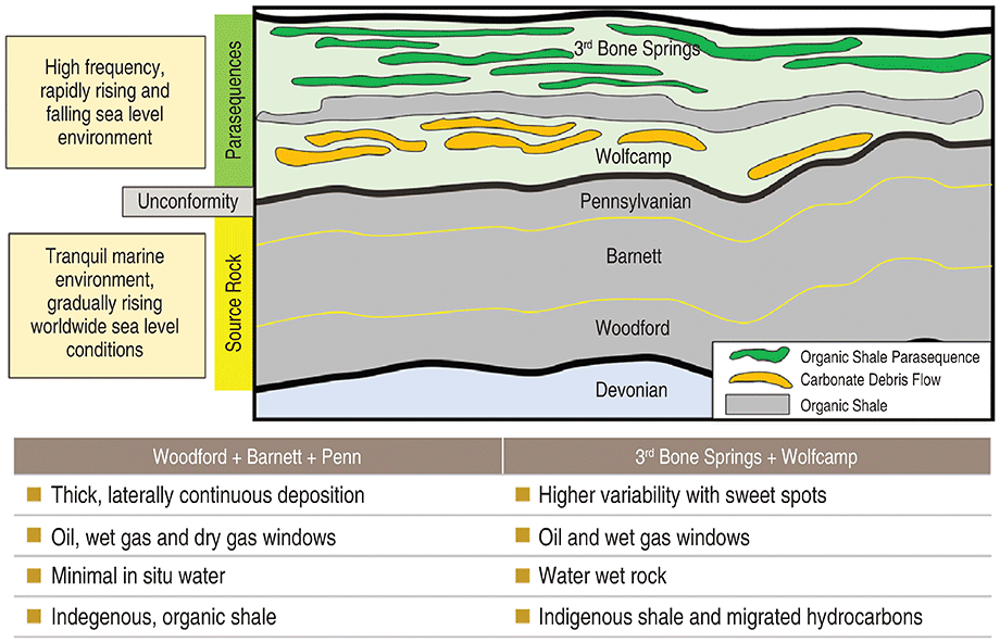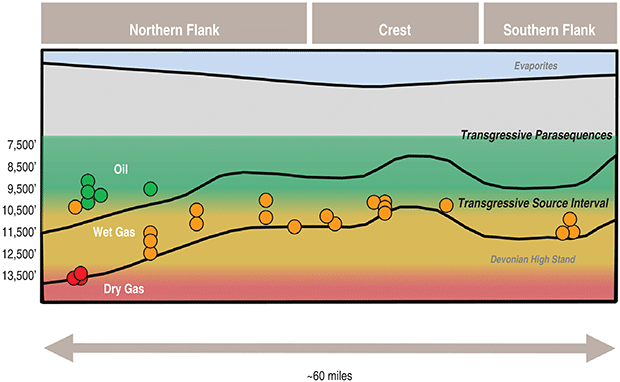 The field’s most striking feature is the thick and contiguous deposition of source rocks spanning from Woodford to Pennsylvanian time (Figure 1A). Apache has delineated the subsurface play environment into a northern flank, a central crest and a southern flank (Figure 1B), with all three hydrocarbon phases encountered in various zones and at various vertical depths across all three regions of the play.