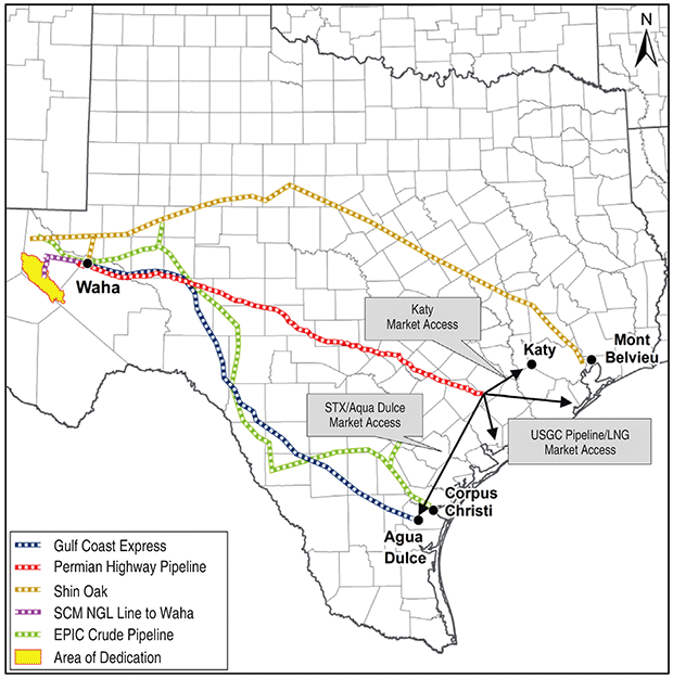The pipeline assets are the vital link that connects the “enormous resource base” in the distant reaches of West Texas with demand centers along the Gulf Coast, including potentially, crude oil, liquefied natural gas and NGL export facilities, according to Bretches. “Having sufficient take-away capacity for the three streams of products is crucial,” he relates. “There is so much value, with the equity options to flow the oil, gas and NGLs to premium Gulf Coast markets, combined with the gas gathering and processing.”