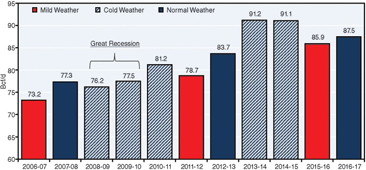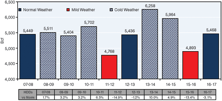 Changes in winter weather can have a significant impact on gas demand in the residential and commercial sectors. For example, the difference in gas demand for the winters of 2013-14 and 2011-12 was 1.855 Tcf, or 16 percent. The long-range forecast is 12 percent colder than last winter, but still relatively mild in comparison with the 30-year average (3 percent warmer).