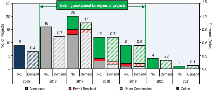 However, the peak period for annual capacity additions in the industrial sector has only begun. In 2016 alone, 16 projects were scheduled to enter service by year-end, expanding gas demand within the industrial sector by 550 MMcf/d. Between 2017 and 2021, an additional 46 new-build and capacity expansion projects are scheduled to begin operating.