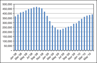 OCTG consumption through the first half of 2010 was about 2.2 million tons, compared with 1.7 million tons in 2009 and 2.5 million tons in 2008. This represents dramatic consecutive year-to-year changes of -32 percent and +29 percent. The U.S. rig count for those same periods changed by -37 and +25 percent, respectively. While much of the economy remains in the doldrums, OCTG demand in the first half of 2010 was only 14 percent below the near record-setting levels of 2008 (Figure 1).