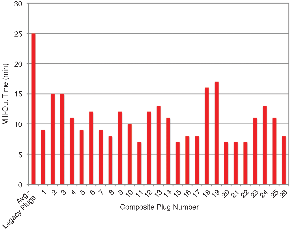 Figure 2 shows mill-out times in an Eagle Ford well. Each plug was milled much faster than the average mill-out time for plugs used in previous wells (far left), with many plugs milling out in half the time. In addition, the composite material consistently mills into small, lightweight cuttings to minimize the risk of plugging surface equipment.