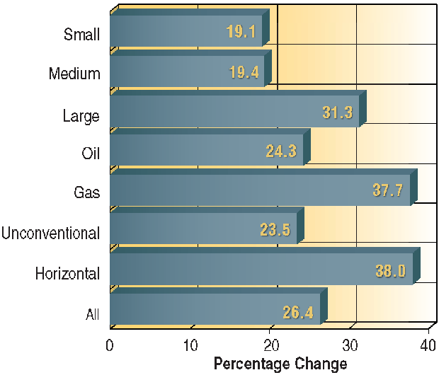 Among those drilling some unconventional wells, 47.6 percent say they expect larger budgets in 2013, although another 38.1 percent say they will spend the same amount as in 2012, while 55.2 percent of respondents that do some horizontal drilling report increased spending plans.