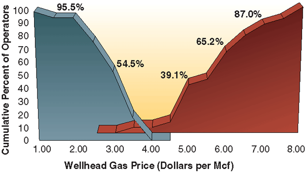 Indicating relatively little tolerance for falling natural gas prices, 18.2 percent of AOGR survey respondents say they will drill fewer wells if gas prices drop to $3.50 an Mcf, and 54.5 percent will drill fewer at $3.00. At $2.50 an Mcf, 77.3 percent of AOGR survey respondents will drill fewer wells, and 95.5 percent will have cut back by the time gas prices drop to $2.00 an Mcf.