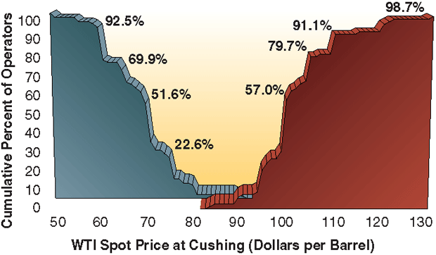 Percentages in Figures 4A and 4B represent the cumulative total of survey respondents that indicate they would have altered their 2013 drilling plans by the time the wellhead natural gas price (Figure 4A) or the spot price for West Texas Intermediate crude oil delivered at Cushing, Ok. (Figure 4B), reached the indicated amount. Prices at which drilling would decrease are plotted to the left of the graphs in downward curves; prices at which drilling would increase are plotted to the right of the graphs in upward curves.