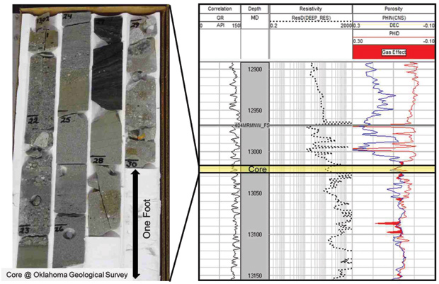 Additionally, grain size, sorting and lithology can change dramatically over small vertical distances in a well bore, as seen in Figure 2. It displays 10 feet of core through the Marmaton C interval in the Valero Brauchi No. 1 well in Beckham County on the left and a log across that interval on the right. The figure shows the limited gamma ray response in drilling through gravels, clean sands and shale, and the effect that one foot of black shale has on the neutron log, causing a deflection to a higher neutron porosity reading (also note the rapid grain size changes). This variation in sediment makes accurate porosity calculations difficult and highlights the importance of gathering core data to help integrate log readings to the rocks.