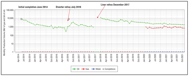 After cementing the liner in place, the well was refractured using the plug-and-perf method with 2,224 pounds/foot of proppant and 53 barrels/foot of fluid. This resulted in an incremental recovery of 367,291 barrels of oil from this completion, for a total recovery estimate of 438,867 barrels of oil, which resulted in a combined recovery factor of 13.5%. If the liner refrac production decline is applied to an AFE of $4 million, the internal rate of return is 102% and net present value is $8.283 million. A new well in the same area yielding similar results on the initial completion has an NPV of $8.518 million, assuming a $6 million AFE.