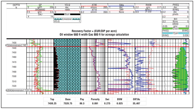 These economics assume prices of $93.63/bbl for oil and $5.59/Mcf for gas in 2022, $83.59 and $4.45, respectively, for 2023, and flat $77.28 and $3.77 for 2024 and beyond. Comparing this volume with the petrophysical oil in place (Figure 2) indicates that the initial frac would recover only 3.0% of the oil in place. At a 60% cluster efficiency, the predicted recovery factor would be 2.2%, increasing to 4.5% at 100% cluster efficiency. When only the stimulated rock volume is producing, the recovery of wide cluster spacing has physical limits driven by the relatively narrow slices of stimulated reservoir volume generated at each cluster (7.5 feet in the case of the ConocoPhillips study).