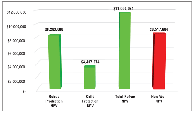 Although the economics of the liner refrac are encouraging, analyzing the production decline alone does not offer a complete picture when the refractured well is a primary or parent well. It is thoroughly documented that infill child wells with offset parent depletion will have asymmetric fracs that do not adequately stimulate the infill drainage area. One operator reported EUR losses of 40% when primary wells were not pressurized prior to completing the infill child well. Using the refrac method to capture that 40% value is worth $3.407 million, which brings the total NPV for the refrac to $11.690 million, or 137% of a new well NPV (Figure 3).