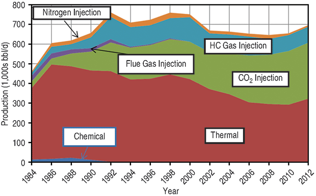 How can the industry bridge the huge gap between available CO2 supply and future demand to recover even a relatively small portion of those reserves with EOR gas injection projects? One answer is in Figure 1, which shows U.S. EOR production by recovery mechanism. The blue wedge is EOR from both miscible and immiscible hydrocarbon gas (non-CO2) injection, virtually all of which is located on the Alaska North Slope.