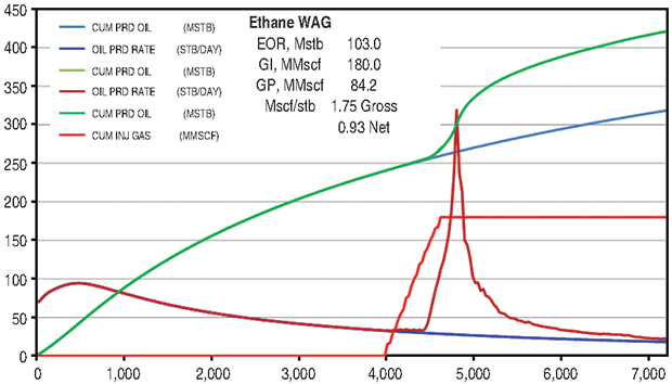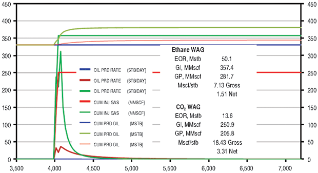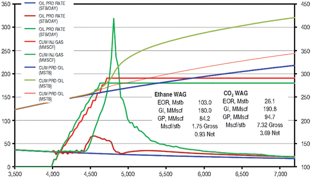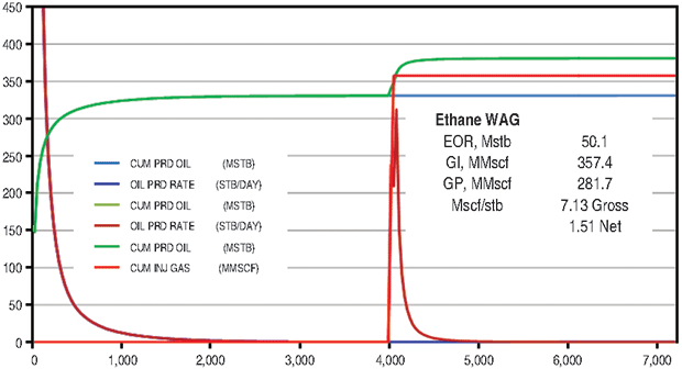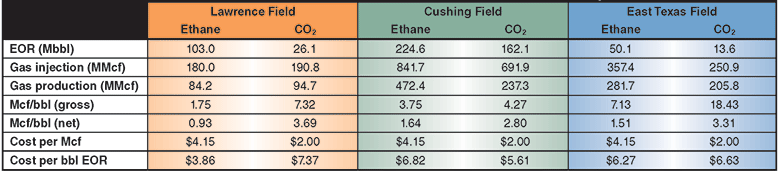 Table 1 shows a summary of the EOR performance, and the gross and net solvent efficiencies for the three example fields at assumed costs of $4.15 an Mcf of ethane and $2.00 an Mcf of CO2. In many locations, ethane is available for less than $1.00 an Mcf because of transportation costs to a sales hub.
