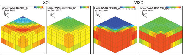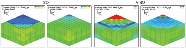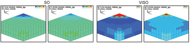 Oil saturation and viscosity maps from the ethane and CO2 WAG runs are in Figure 3. The ethane WAG was miscible and reduced the oil viscosity by a factor of 10. The CO2 WAG was not miscible, and reduced the oil viscosity by about half.