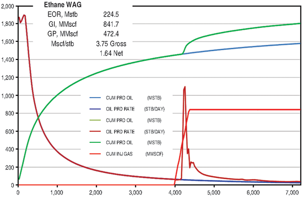 A final advantage of ethane over CO2 is that the produced gas from an ethane WAG flood has intrinsic value as sales gas or fuel, and no acid-gas removal plant is required either for gas sales or reinjection. High gas-to-oil ratio fields before significant ethane breakthrough could produce lean gas that was too diluted with methane to make recycling desirable. The gas could continue to be sold or burned for fuel until the gas C2+ mole fraction becomes high enough to be a good injectant. Eventually, returned ethane will overwhelm the produced solution gas.