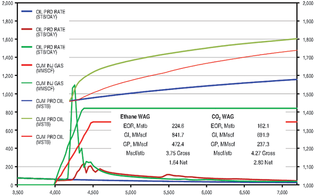 As with any gas injection project, tubing collar leaks could be a problem with ethane injection. New or reconditioned tubing with premium threads and an ethane-resistant thread compound may be warranted. The advantages of ethane WAG over CO2 WAG will be particularly important in areas with limited corrosion problems where the produced oil is sweet.
