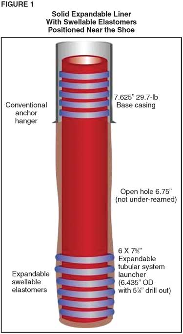 The well bore logs revealed reasonable gauge hole just below the loss zone, which led to redesigning the solid expandable liner to an optimum size, and positioned swellable elastomers immediately above the shoe of the expandable liner (Figure 1). A conventional liner hanger (anchor), run at the top of the solid expandable liner, would seal in the 75⁄8-inch base casing.