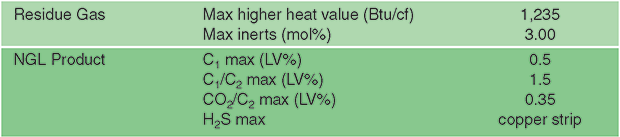 Since the Front Range Pipeline could accept all types of NGL products, operational gas processing flexibility for the new facility would be valuable. Subsequent to the NGL transportation projects’ completion, Anadarko dropped its interests in the Front Range and Texas Express Pipeline to Western Gas Partners. Western Gas’s goal was to build a state-of-the-art facility that could achieve high product recoveries and have the flexibility to respond to changes in delivery options and the NGL market. The product specifications are summarized in Table 1. The requirements follow a typical Y-grade specification, restricting maximum content of methane, methane-in-ethane, carbon dioxide-in-ethane, and hydrogen sulfide. When rejecting ethane, the only NGL content concern is the sulfur compounds. However, the residue gas specifications mandate a maximum heating value (which can be a concern when rejecting ethane) and a maximum CO2 content.