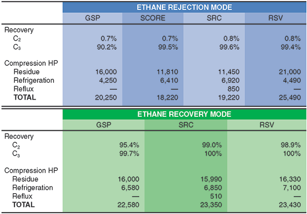 The GSP, RSV and SRC designs also were considered for full ethane recovery mode operations for the Lancaster rich-gas design basis. The bottom of Table 2 summarizes the maximum ethane recovery mode results for the three process design options. Each design had similar refrigeration and front-end exchanger arrangements, so the process design reflux system performance alone was the dominant factor in the overall recovery-versus-horsepower results.