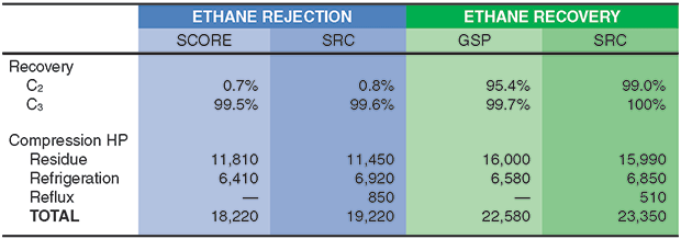From full ethane rejection to 30 percent ethane recovery, SCORE or SRC were the preferred process designs with much higher propane recovery than GSP. At similar total horsepower requirements, SRC propane recovery was 99.4 percent at 30 percent ethane recovery and 100 percent at 99 percent ethane recovery, compared with 95.1 percent at 30 percent ethane recovery and 99.7 percent at 95.4 percent ethane recovery for GSP.