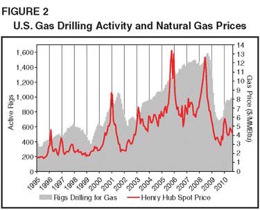 Winter 2010-11 working gas storage levels can be expected to remain above historic averages because supply/demand softness is likely to persist as the economy gradually recovers. Of course, large consumers such as those in the industrial and power generation sectors like to see charts such as the storage data plotted in Figure 5 because it suggests a muting of the sharp seasonal price swings experienced earlier this decade, when the supply/demand balance was exceptionally tight.