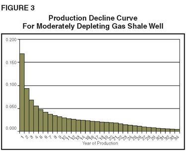 But there is a catch to unconventional gas: the depletion factor. Although shale wells have high initial rates and production tails that span many years, production declines sharply within the first year (Figure 3). It is not unusual in these plays for a well to make eight to 10 times less gas at the end of the first year than when it began producing. Typically, 15-20 percent of a well’s EUR is produced in the first 12 months. The production decline then slows through the second and third years until the daily rate stabilizes in the fourth or fifth year, where it tends to remain fairly constant.