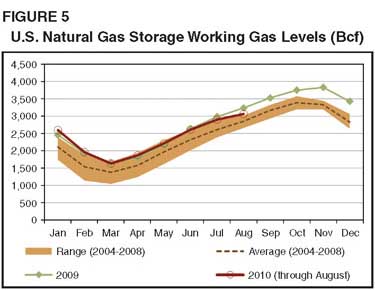 In the near term, the fundamentals point to a continuation of the conditions that have prevailed in the gas market for the past several months. Growing domestic supply output coupled with recession-weakened demand have led to relatively high storage inventories, creating downward pressure on prices. Slightly colder than normal weather last winter reduced the storage surplus, but inventories are still well above the five-year average.